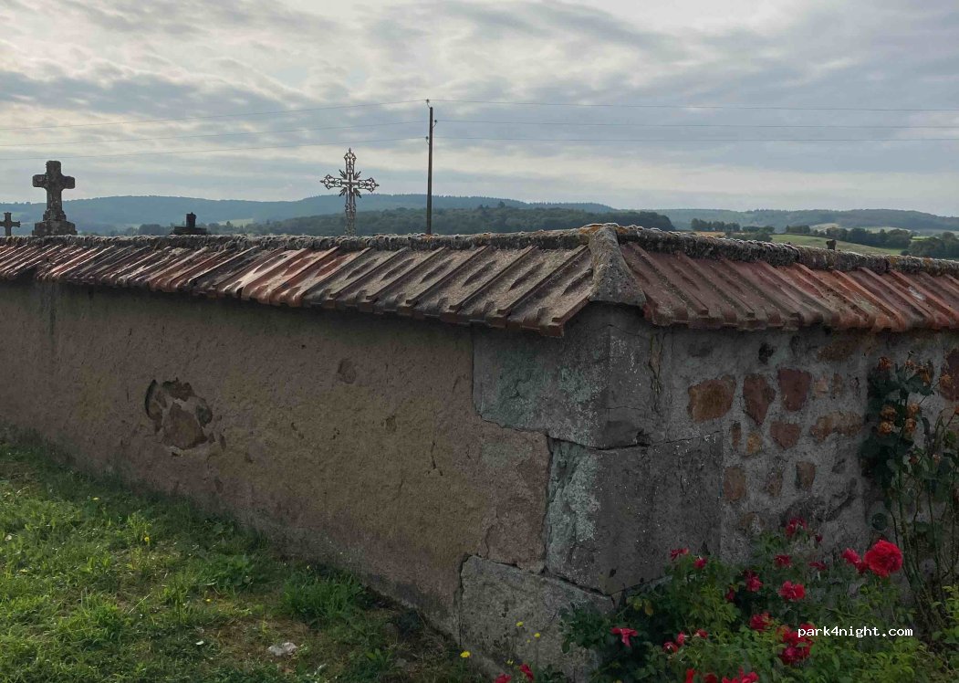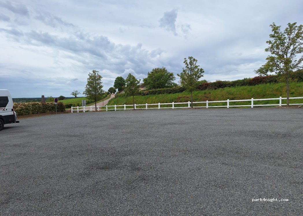 Parking gratuit avec sol en gravillons. En centre bourg. Pas d'interdiction de stationner. Vue sur la campagne et proche d'une table d'orientation. Très calme. Aucun service. Seulement recyclage verre et papier.