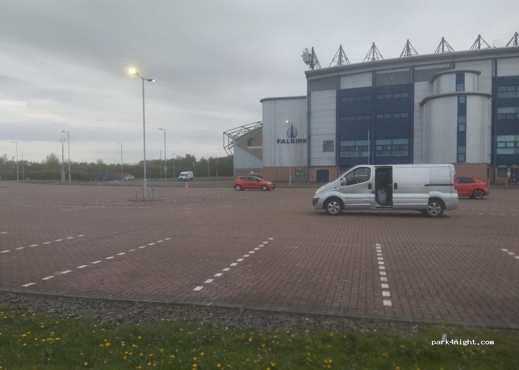 Car park for Falkirk Stadium, parking is free. The main gate is closed around 20:00 to 21:30 depending on the season. No restriction signs. Easy free access to the Kelpies a 2km walk away. Perhaps do check that a football match is not on the day you plan to be there as I am sure little to no space available.