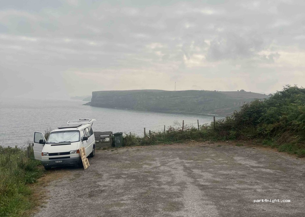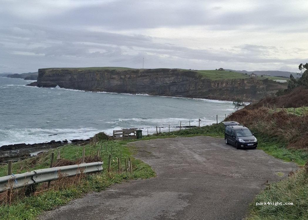 Lugar con vistas espectaculares al borde del acantilado y con vistas al Bolao, para llegar hay un cruce hacia la derecha que es de pago junto a la playa pero este es a la izquierda, carretera es estrecha pero con furgo se va bien. pasamos una noche y había dos furgonetas más, desde allí se puede bajar a pie hasta la playa de rocas.con viento y lluvia estás un poco desprotegido.