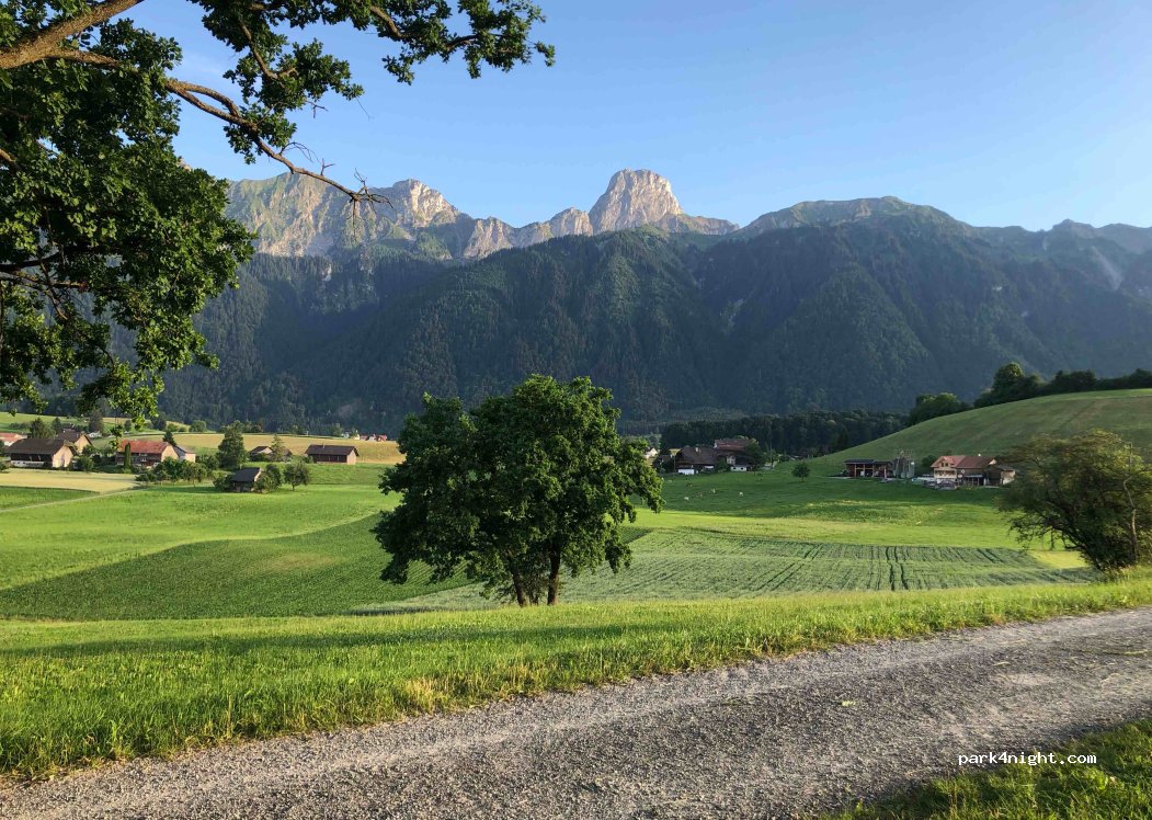 Paved parking space in tranquil Amsoldingen. Quiet location with beautiful mountain views, close to shops. The village cheese dairy is right next door and in the distillery opposite the parking space you can buy various drinks. Beautiful hikes and bike routes right on your doorstep. Visit the cities of Thun and Bern from here. Or how about a steamboat trip on Lake Thun? We are happy to give you tips on beautiful excursions in the region. Please report to the distillery on arrival or if no one is there, scan the QR code for information.