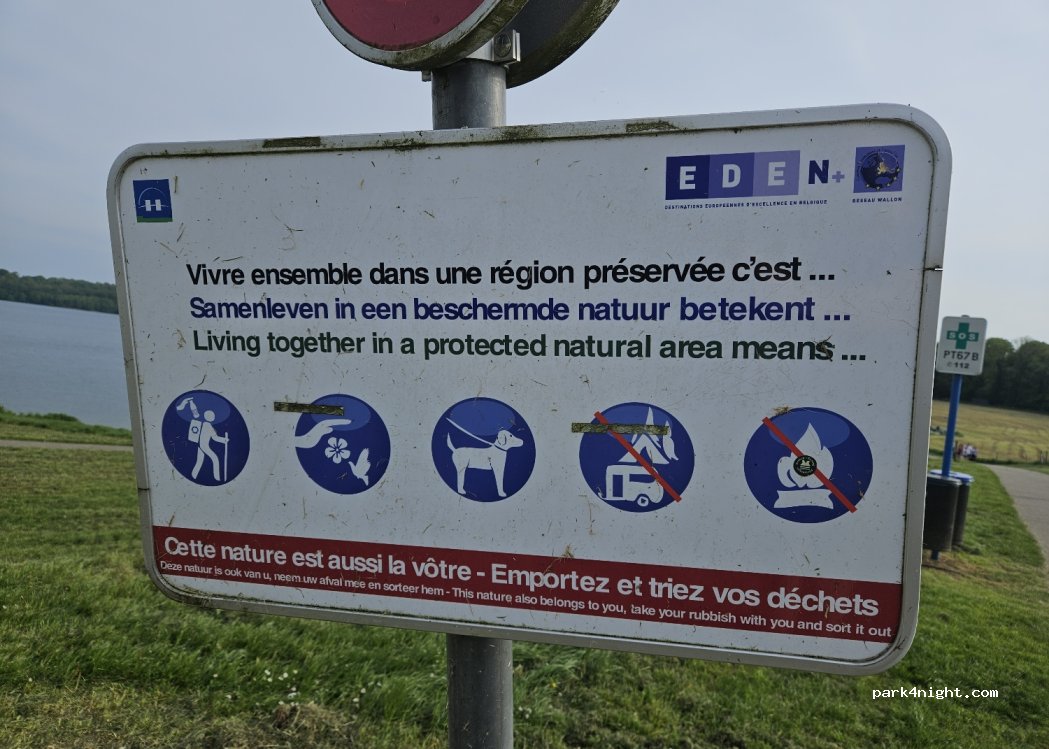 Op parking le lac de l’eau d’Heure is overnachten in camper toegelaten. Er zijn geen services. Parking heeft wel slagbomen welke in het hoogseizoen waarschijnlijk sluiten. Overdag frituur en ijskraam aanwezig.