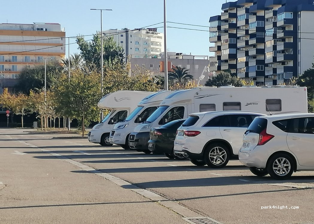 Perfecto para pasar el día. Autocaravanas largas pueden meter el voladizo entre plaza y plaza de aparcamiento. La noche también la puedes pasar pero yo no lo recomiendo porque la discoteca Bacarrá está justo enfrente. No hay problema de seguridad pero el fiestón que se trae la gente hace imposible dormir.