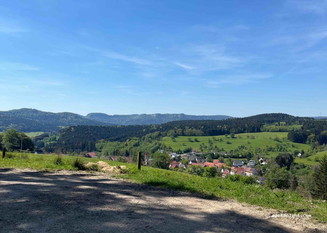 Kleiner Parkplatz am Feldwegrand/ Waldrand mit grandioser Aussicht. Nur für autarke Wohnmobile. WC beim Friedhof 500m möglich.