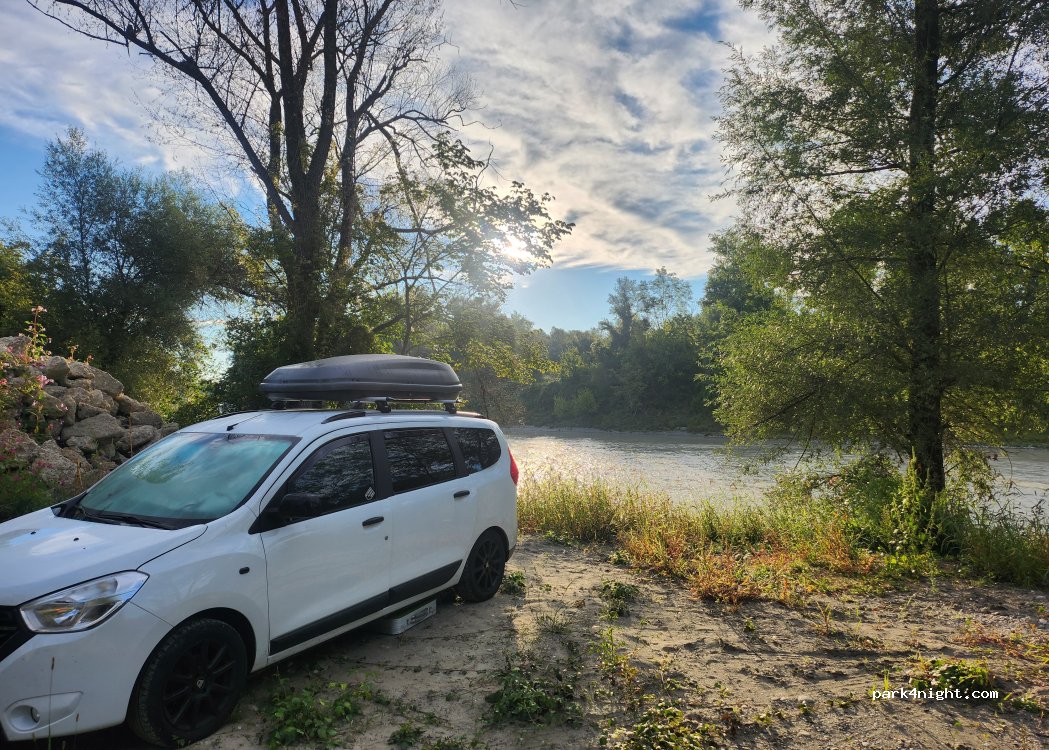 Toller Platz, schön versteckt hinter Steinbergen inklusive Flussrauschen. Zugang zum Wasser steil aber möglich. Starke Strömung. Der genannte Baumstamm kann bequem umfahren werden. Zufahrt max. mit Campervan, nicht mit Wohnmobil möglich. Da doch recht nah an der Straße, hört man diese ab morgens. Nachts wenig befahren. Wir waren 18 Stunden da und haben keine Menschenseele getroffen.