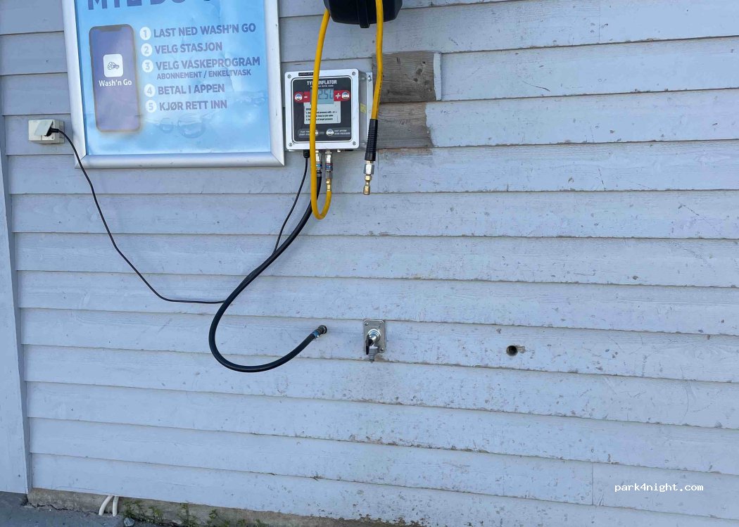 Entleerung von Grau- und Schwarzwasser möglich. Trinkwasser nicht vorhanden. kostet 50kr. bezahlbar per vipps oder in der Tankstelle.