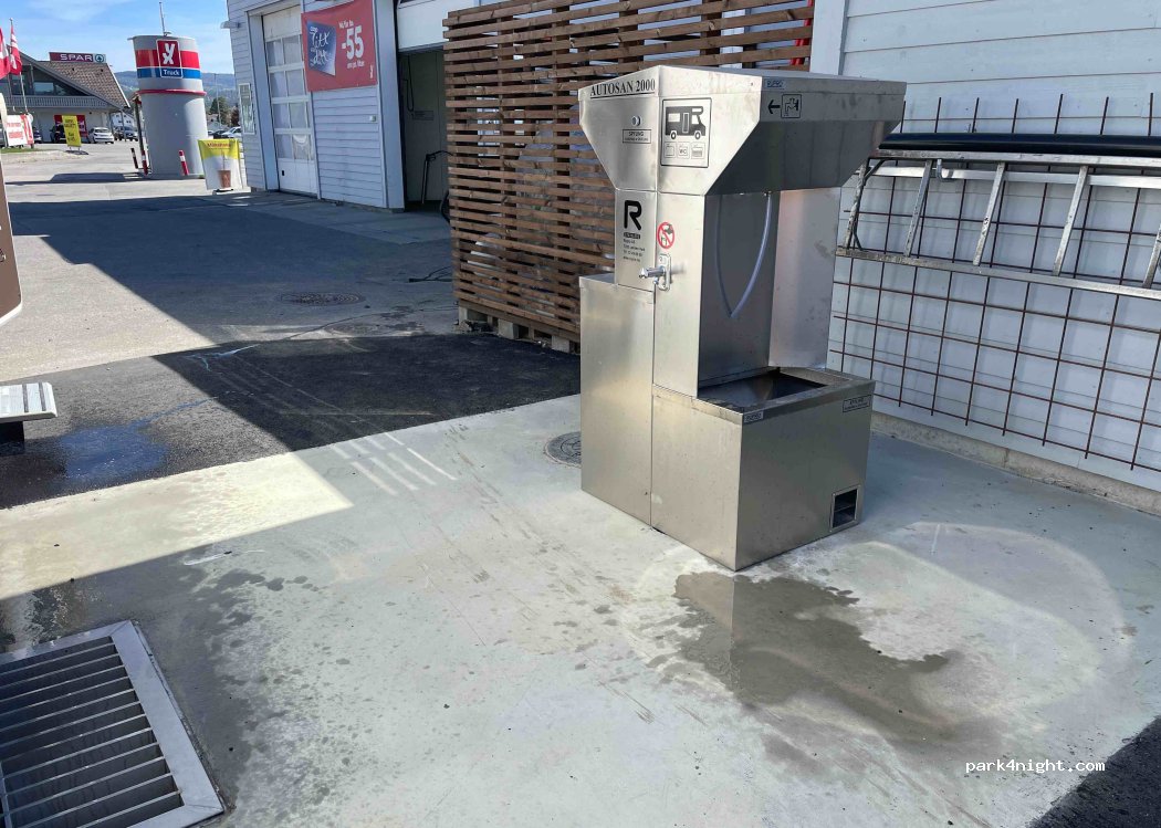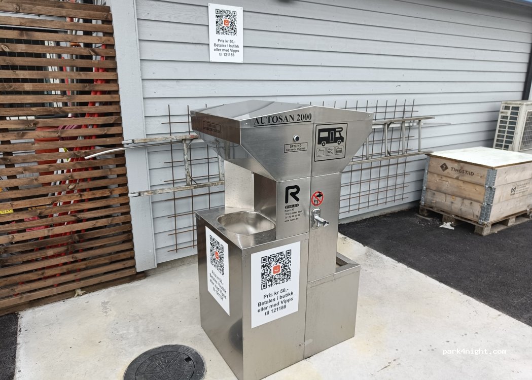 A small fee of 50NKR to use the machine, but it's great and has all the necessary services, black, grey and fresh water. If you don't have vipps you can pay by card in the petrol station.