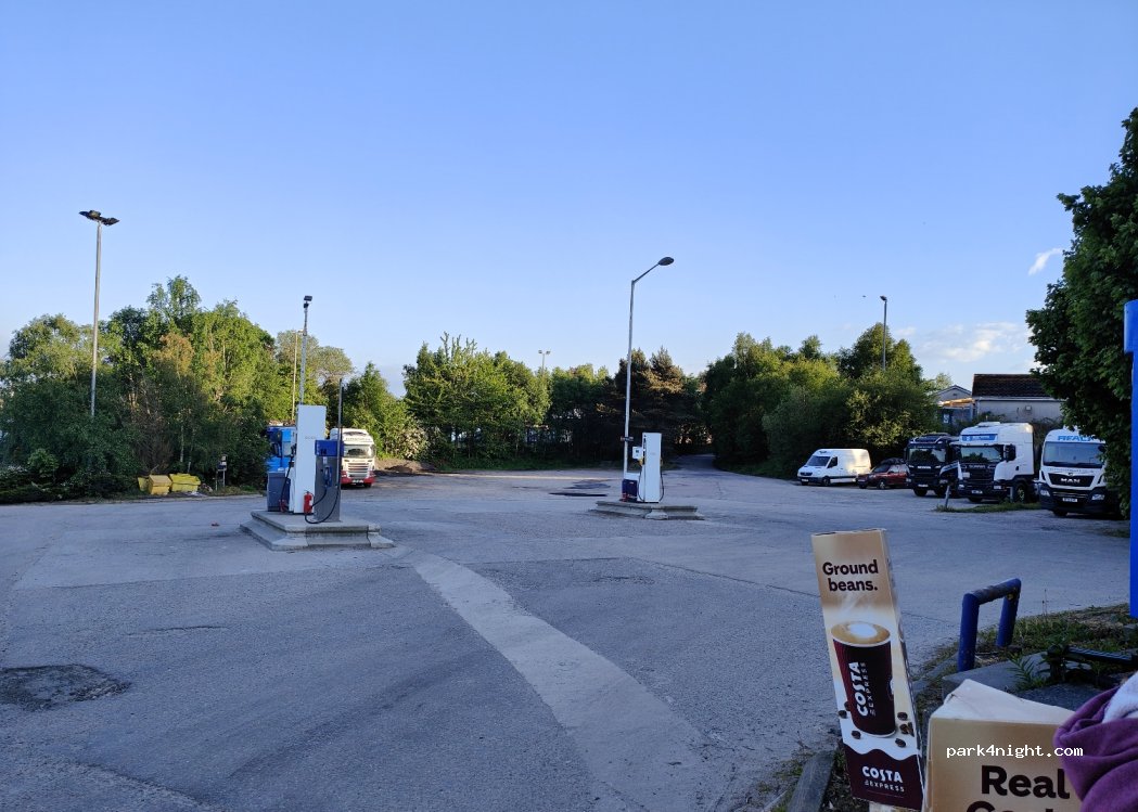 Station avec un grand parking pour les poubelles et le carburant