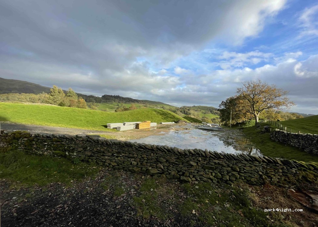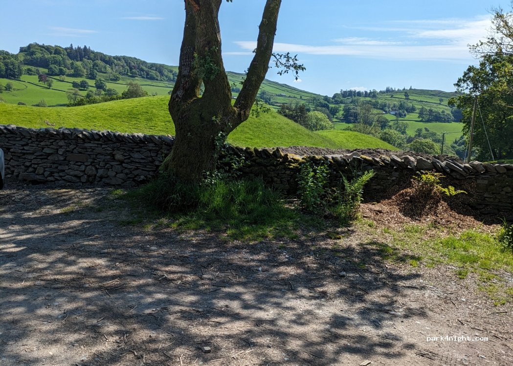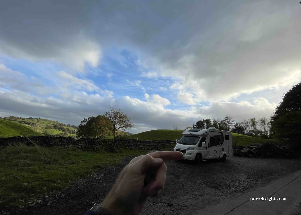 Layby with great views. Room for a couple of vans without blocking gate. No signs.