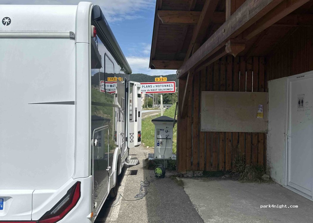 En plein hiver (vacances scolaires ) borne hors d'usage à cause du gel. Possibilité de prendre de l'eau avec un bidon dans les toilettes publiques à côté mais impossible de vider les eaux noirs et grises. Pour remplir et vider, il y a une borne au camping de Champdor à environ 10 kms qui est ouvert toute l'année.