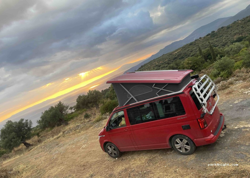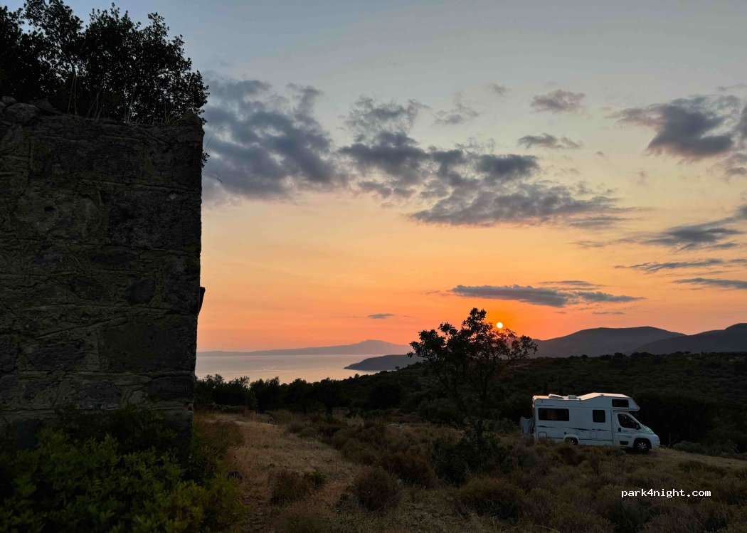 En fait il y a 3 ou 4 places en tout, mais c’est pré du village et je pense qu’ils vont en avoir marre de nous voir là… . Il y a des chiens qui aboient comme toujours pré des habitations en Grèce. L’endroit est propre, c’est déjà pas mal aussi.