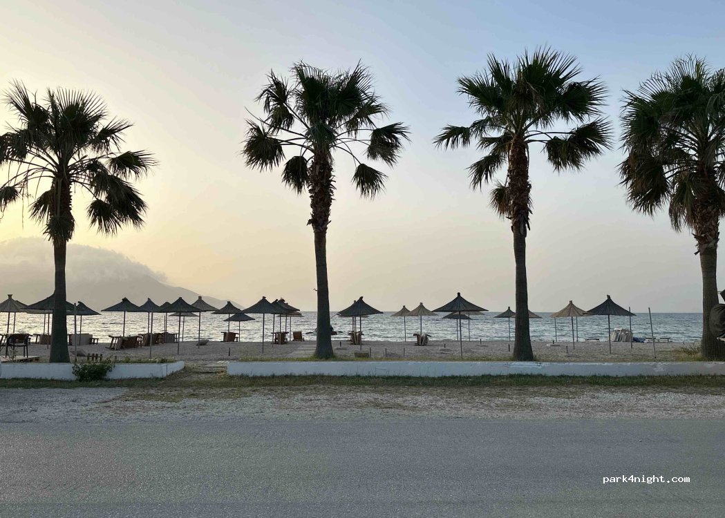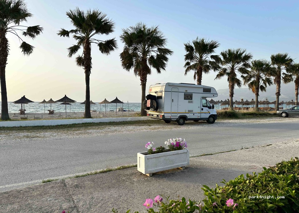 Schöner Strandabschnitt mit vielen Stellmöglichkeiten. In der Nebensaison abends ruhig. Gegenüber der Straße finden sich viele Restaurants und Bars, deren WLAN man nutzen kann.