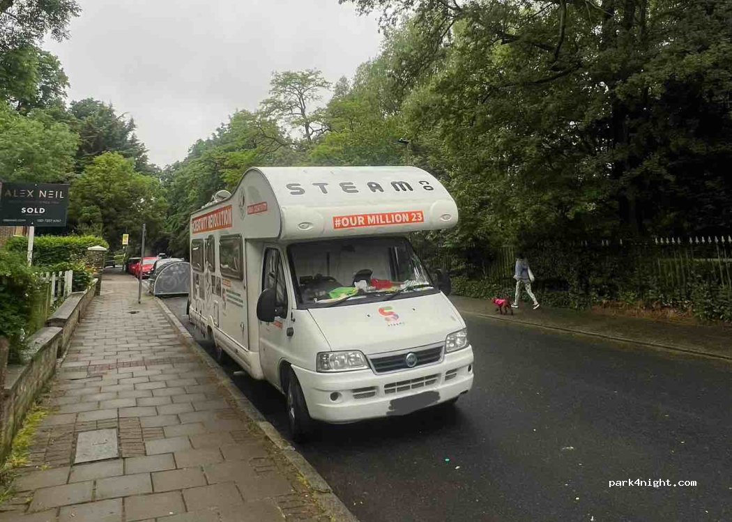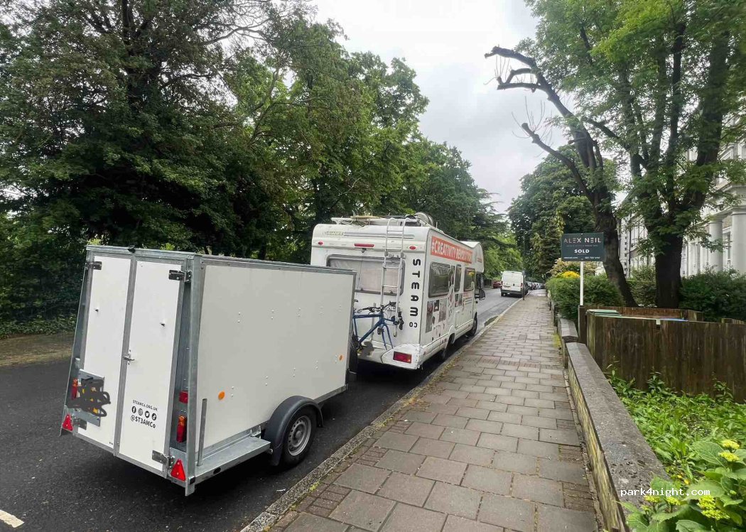 Parking sans restriction 24h/24 en bordure du parc Crystal Palace - quartier résidentiel sûr mais, malgré une limite de 20 mph, pas mal de voitures dans une rue à sens unique donc un peu bruyant mais j'ai réussi à passer une nuit de sommeil ininterrompue. Occupé le week-end apparemment mais presque vide aujourd'hui (mardi). Une vraie trouvaille, n’en abusez pas en faisant du désordre.