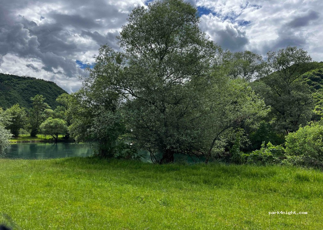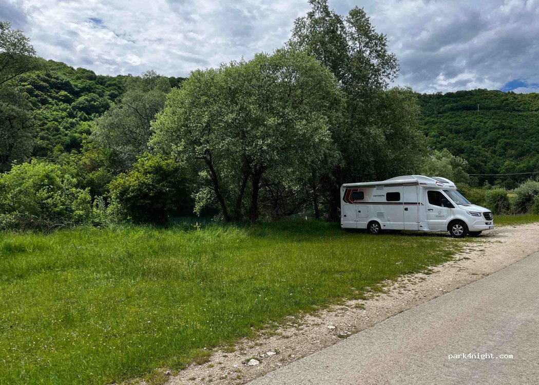 Sehr Idyllischer Platz direkt am Fluss. 100m nebenan ist ein kleiner See mit einer Bar. Hatten eine ruhige Nacht. Wenn man von Jezero her kommt gibt es keine Höhenbegrenzung:)