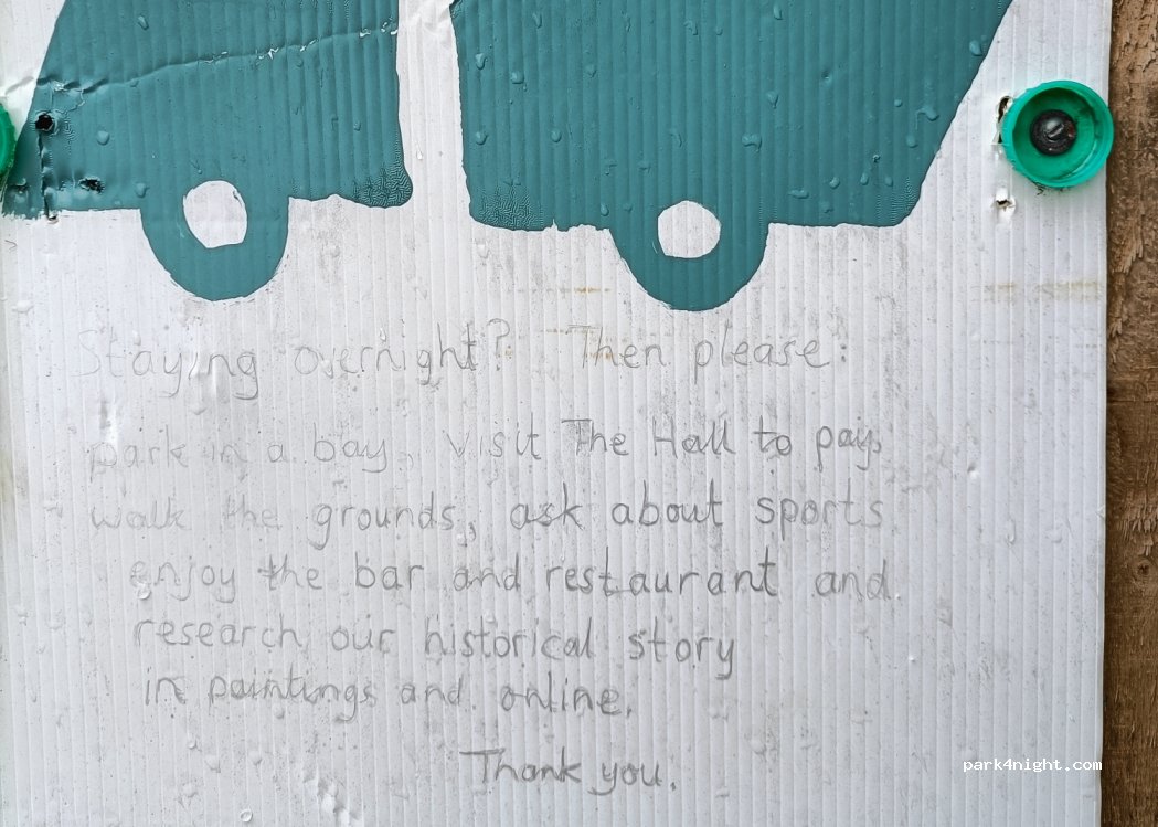 Stayed last night with 5 other vans in the parking area near the Manor House surrounded by extensive grounds and golf course. Far bigger than i anticipated. Friendly staff in the Manor House reception/bar. No noise at night as far away from roads etc. The only gripe would be no loo paper in the toilets but apparently they keep going ‘missing’..
