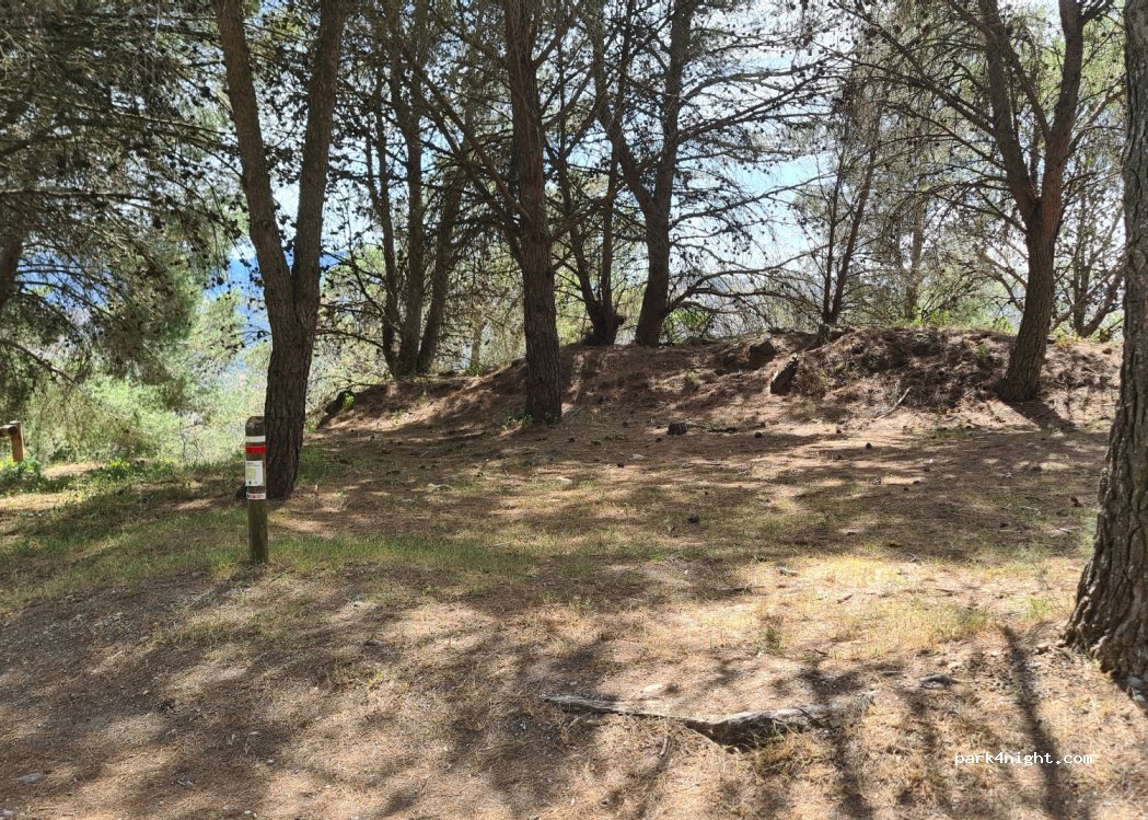 Petite place à l'entrée du sous-bois, pour un ou deux véhicules. À l'ombre en pleine nature, donne sur un chemin de randonnée. Situé tout en haut, à la fin de la route juste avant un mirador pas indiqué sur les panneaux. Calme et tranquille, pas de passage, aucun service. Seul petit défaut, sous un couloir aérien donc il y a pas mal d'avions qui passent, cela dit on a pas été dérangé la nuit. On a reçu la visite d'un petit renard.