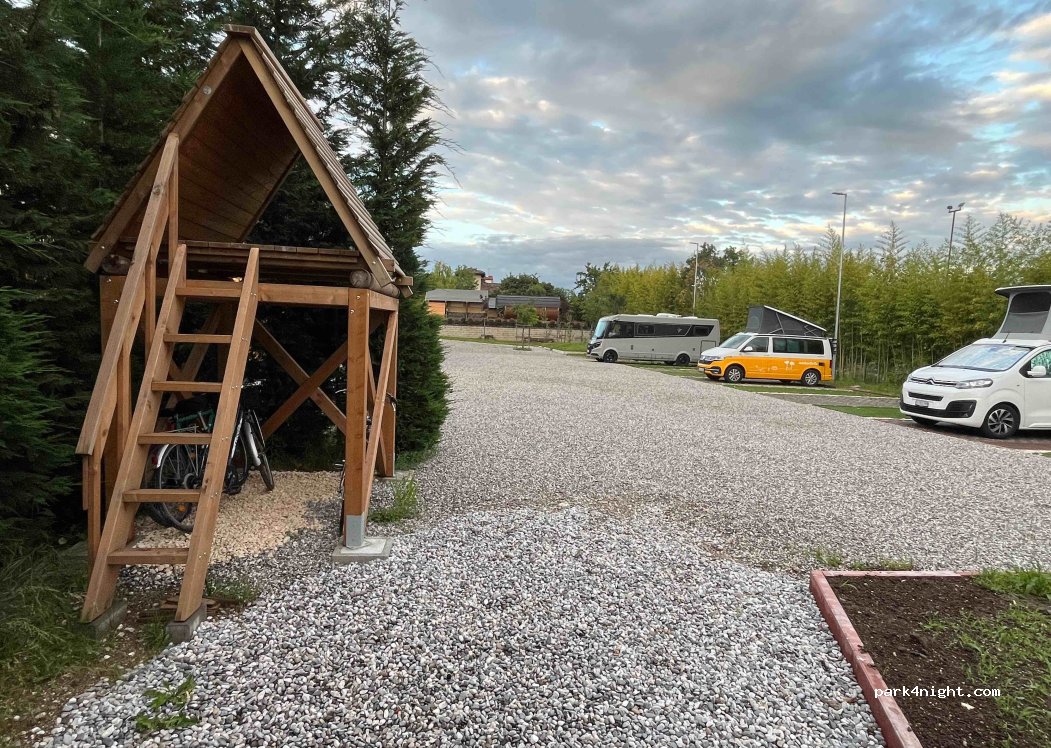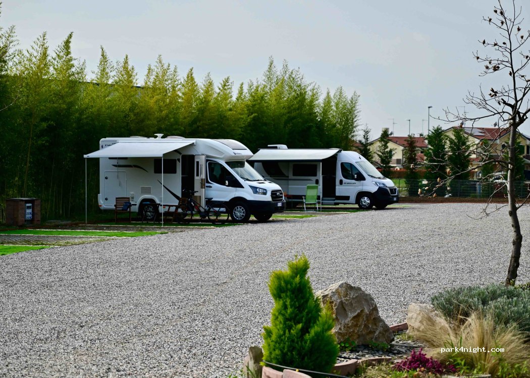 agréablement surprise par cette aire très bien entretenue,proposant de nombreux services ; restaurant al vecchio tram a 2 minutes a pied; possible de louer une byd a 39 € la journée ; possible d'acheter sur place des boissons fraîches (eau gazeuse,prosecco, jus de fruits); 54 € pour 2 adultes et 2 enfants (-10% avec ACSI) ; tarifs degressifs