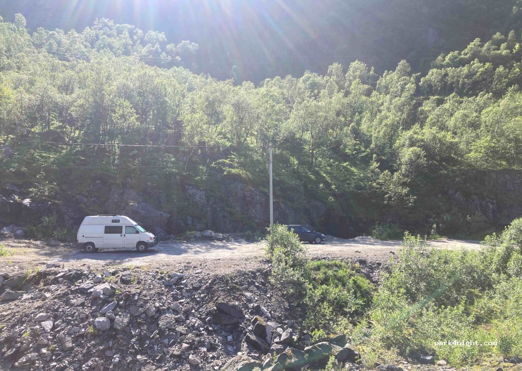 Wir stehen gerade mit vier Wohnmobilen zwischen sechs und sieben Metern Länge hier plus einem PKW und es wäre noch Platz. Es ist Anfang Juli, 22 Uhr und die Mitternachtssonne leuchtet herrlich in unseren Fjord hinein. Ein schöner Platz und dann auch noch kostenlos.