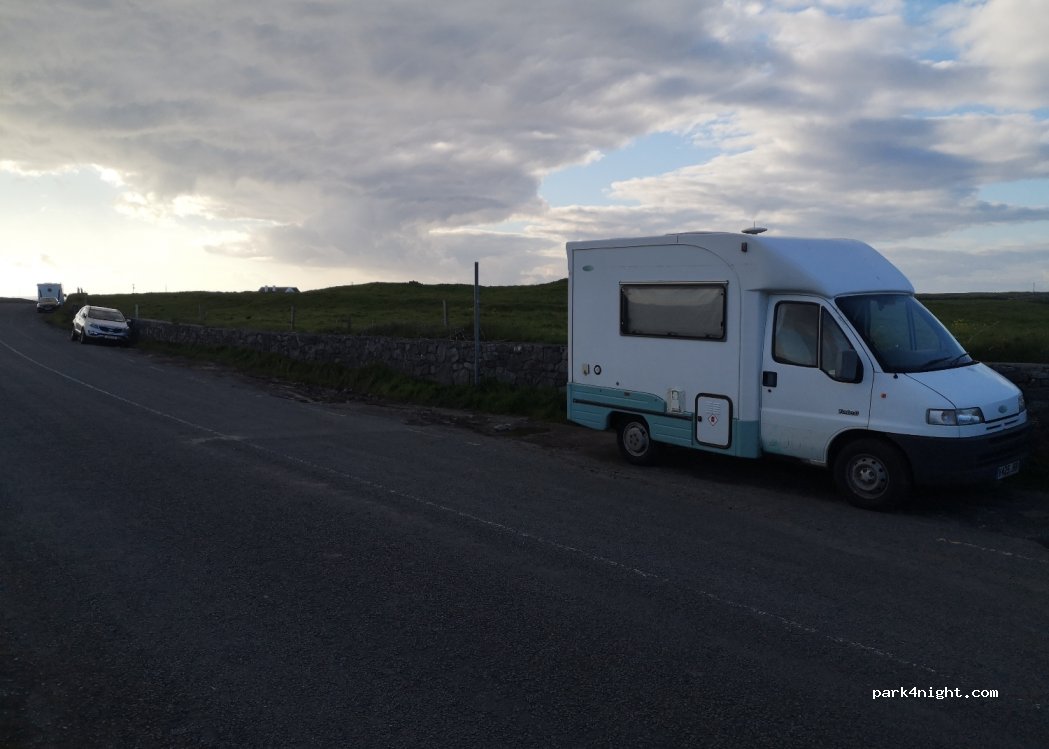 Pas idéal pour être tranquille mais pour passer la nuit proche du port de Doolin (15 min à pied) c'est pratique. Directement après le parking en bataille pour voiture c'est en pente mais un peu plus haut on peut réussir à se mettre de niveau avec les cales. Couché de soleil le soir en marchant vers le port et petit pub juste en bas à 200m à pied.