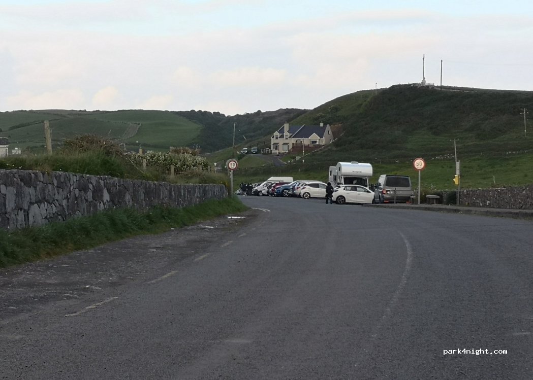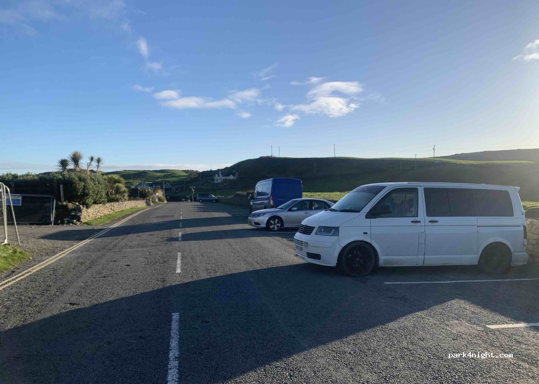 Stationnement gratuit en bord de route en épi pour les petits gabarits, le long de la route pour les plus gros. Bien pour faire la belle randonnée au bord des falaises. Pour la nuit c'est pas terrible mais nous y sommes restés après être passé au pub... super ambiance, beaucoup de monde y mangent et y boivent accompagné de musique locale.