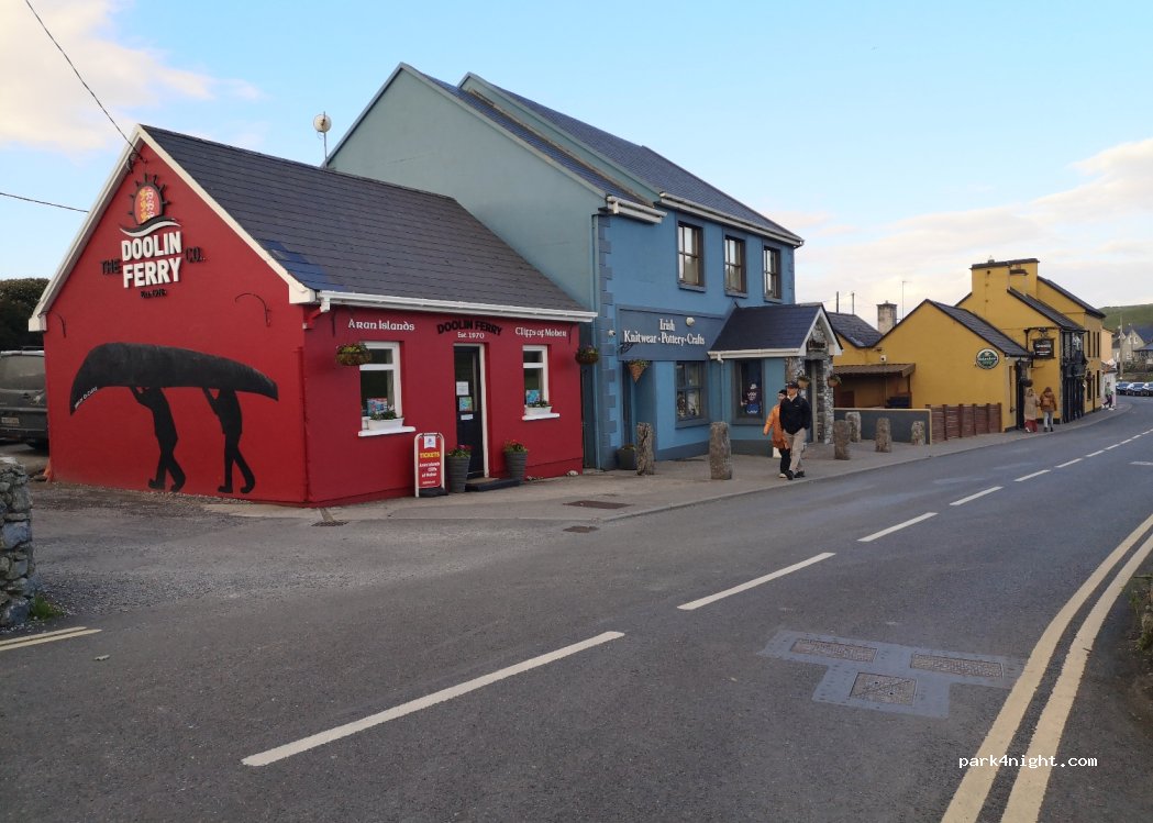 Parking en bord de route, plus plat un peu plus haut, entre le village de Doolin et la jetée avec de jolies vues de chaque côté. Idéal pour visiter le joli village. Route calme la nuit mais très fréquentée à partir de 8h30 environ. Des pubs sympas à visiter.