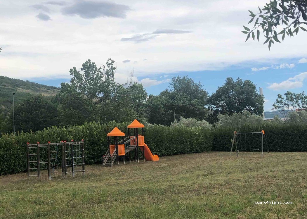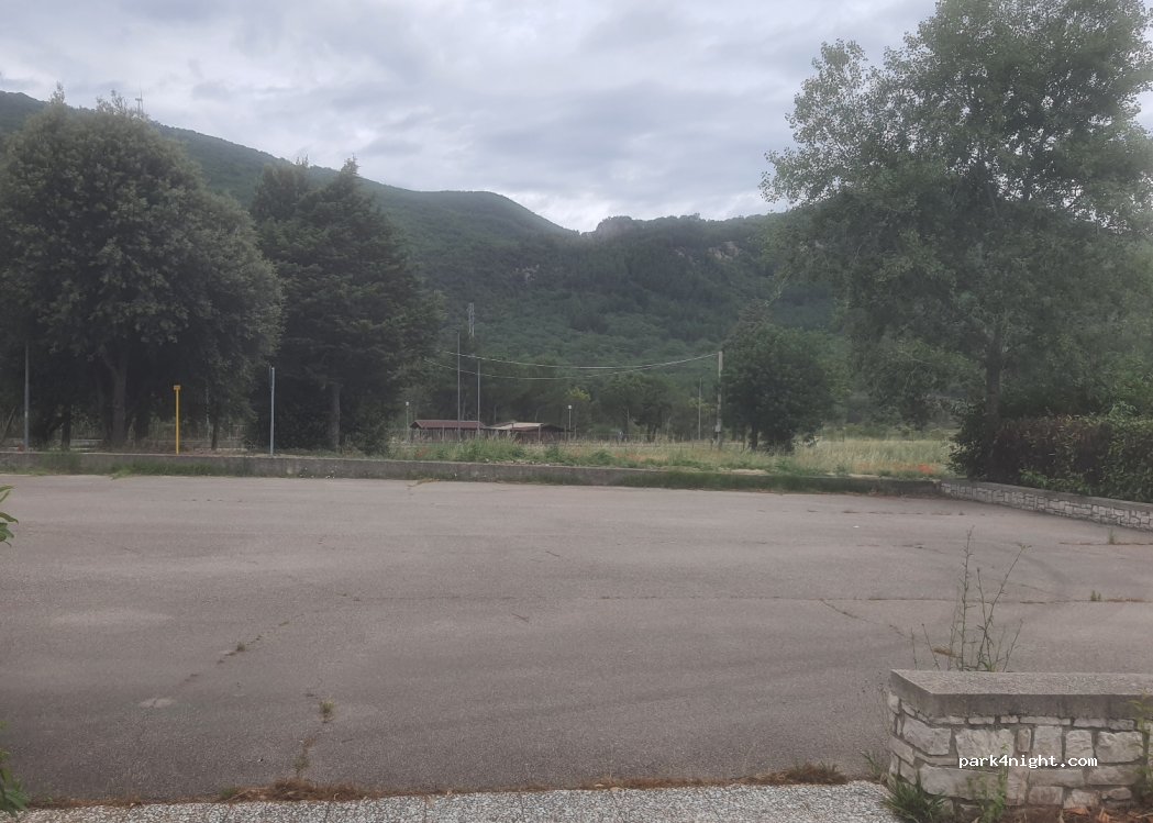 Asphalt parking at 200mts from the Sanctuary of Santa Maria del Canneto, flat, without shade, without services, safe and with children's play area