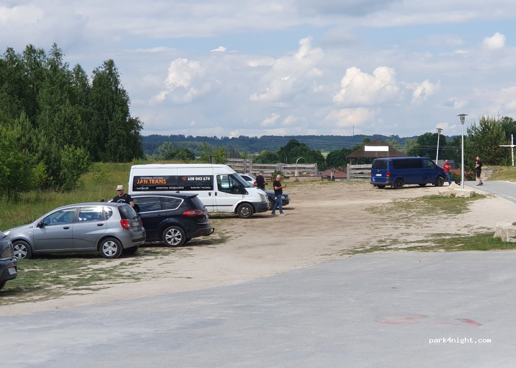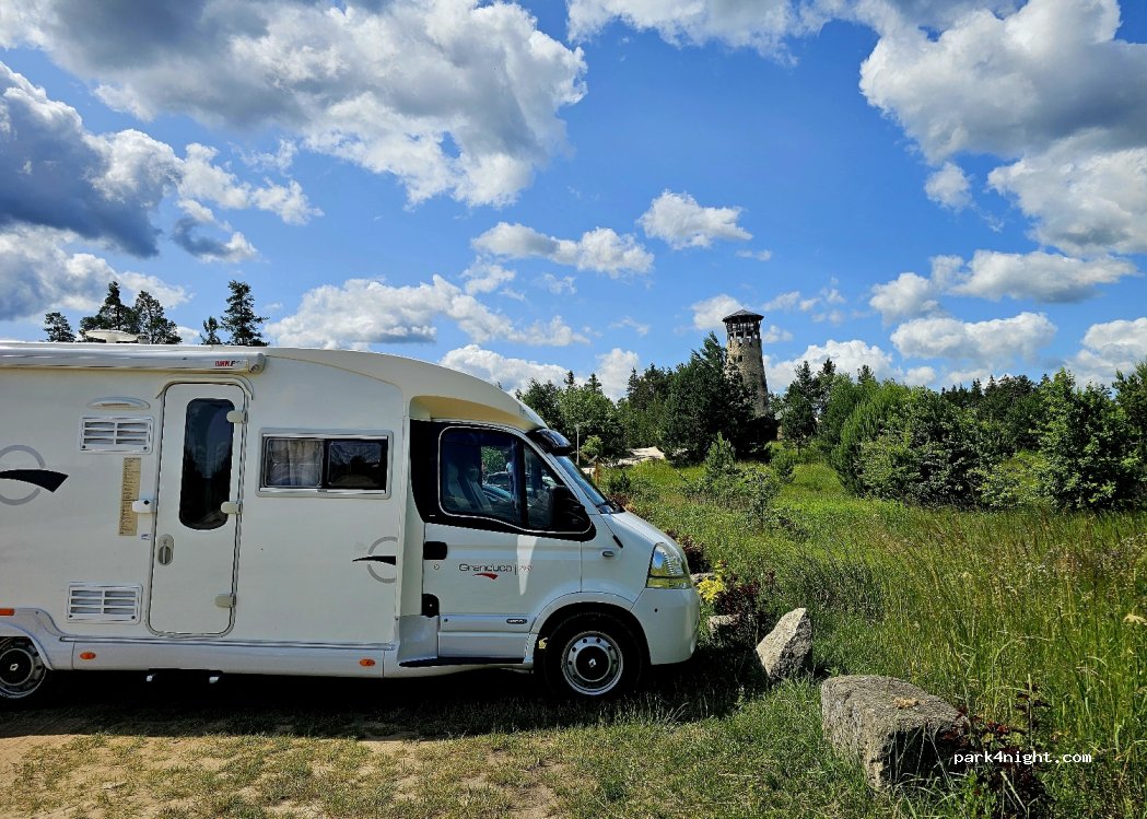 Parking przy wieży widokowej i kamieniołomie, wiata i miejsce na ognisko. Na nockę w trasie zawsze lepsze to niż parking przy drodze lub w mieście