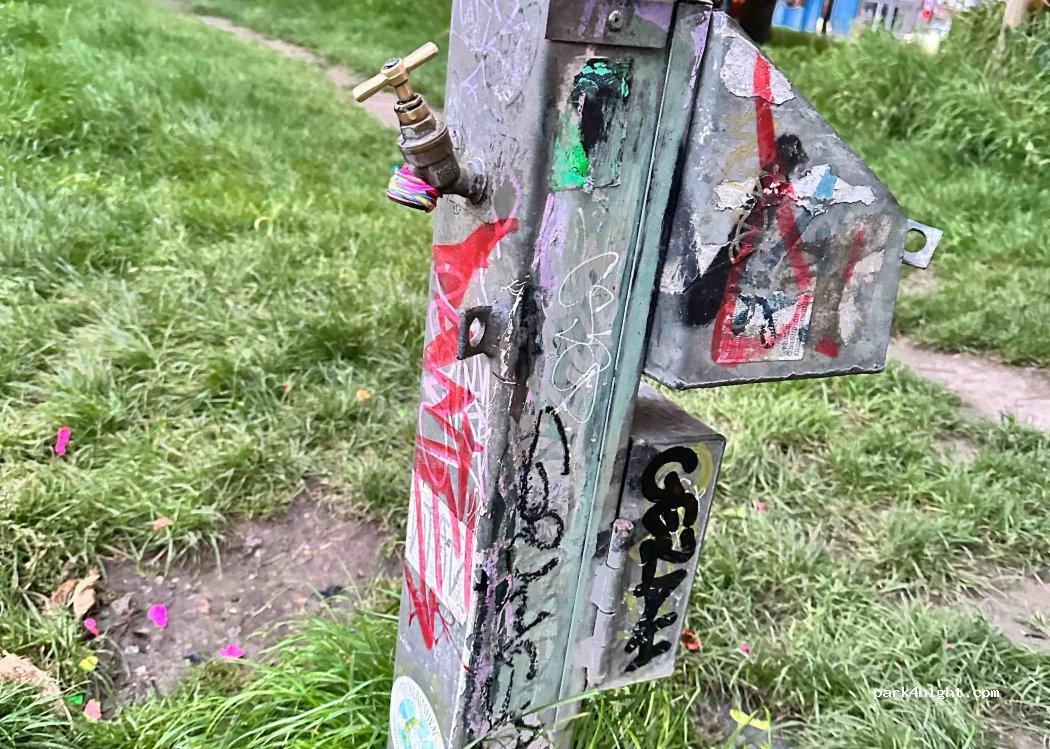 Ich musste zwar kurz mit Warnblinker an der Straße parken, aber dank starkem Durchfluss, benötigt man nur 2/3min, um 2 Kanister zu füllen. Der Hahn ist vorn am Rand der Wiese, am Radweg, am Parkbeginn, ca. 20m vor der 1. Ampel