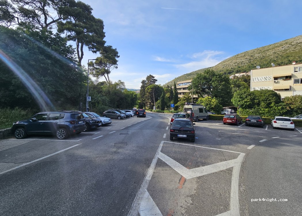 Wahrscheinlich darf man dort schlafen, aber vielleicht sind nur ein oder zwei Plätze annähernd eben. Es ist ein guter Platz, um tagsüber zu parken und Dubrovnik zu besichtigen. Außerdem ist Bellevue Beach ganz in der Nähe.