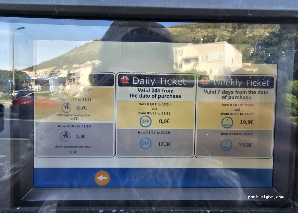 Small parking lot for around 30-40 cars, 20 minute walk from old town Dubrovnik. Fares are way lower than most place I've found.