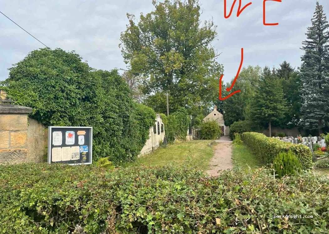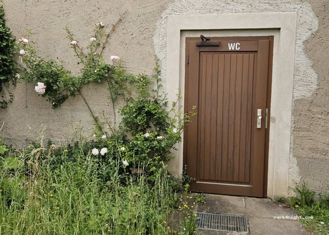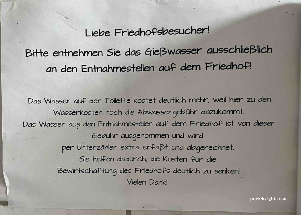 Auf dem Friedhof gibt es eine öffentliche Toilette, die immer (auch Nachts!!) geöffnet ist (kleines Tor, dann geradeaus). Bitte keinen Müll zurücklassen! Übernachten problemlos möglich! Bitte auf der Friedhofseite parken, um die Anwohner nicht zu stören.