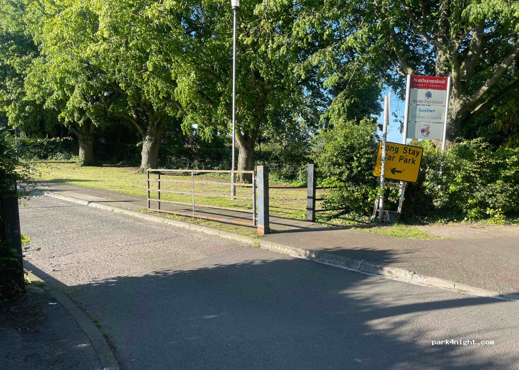 Used to be Wooler First School / SureStart Children’s Centre but council created a large free car park following the demolition of the buildings. There are bins, picnic benches, grass areas to walk dogs and level parking for lots of vans. June ‘24, advertised as a long stay overstill car park with no signage for restrictions, payment etc and no height barriers. We had the entire place to ourselves, amazing hidden spot.