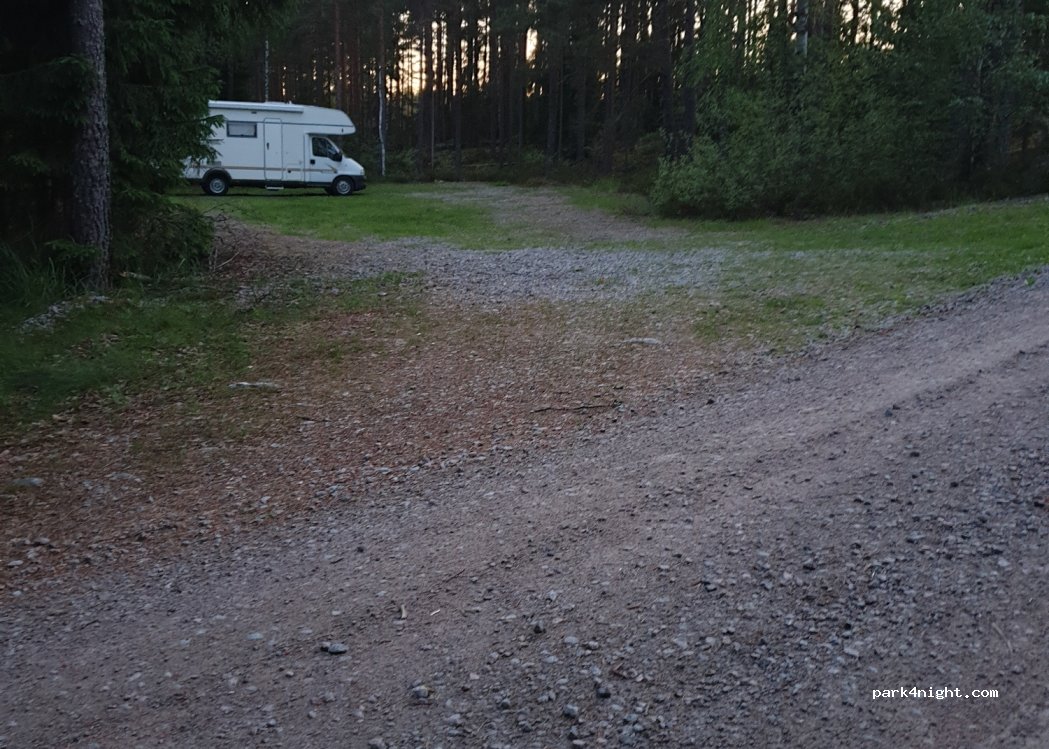 Gravel field 25x10 m. There is some traffic on the road. An ok place to stay for one night. A lot of mosquitoes. The dogs can cool off in the lake. Paths exist but have not explored them.