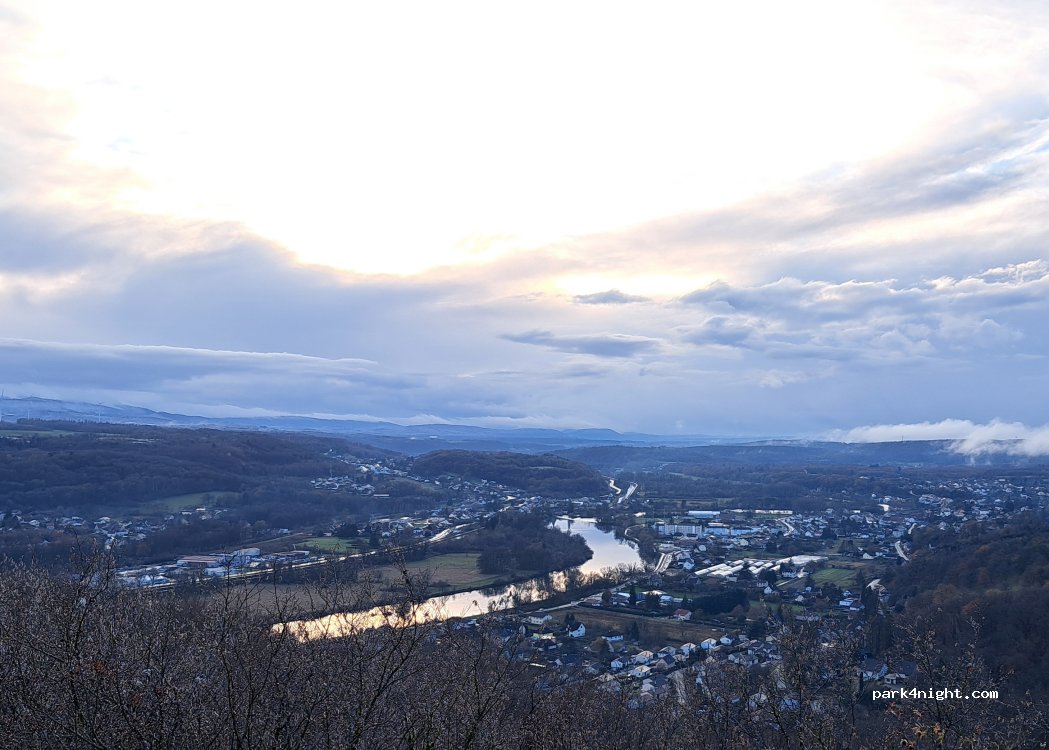 schöner Sonnenuntergang und toller Ausblick von mehreren Bänken oberhalb des Parkplatzes;