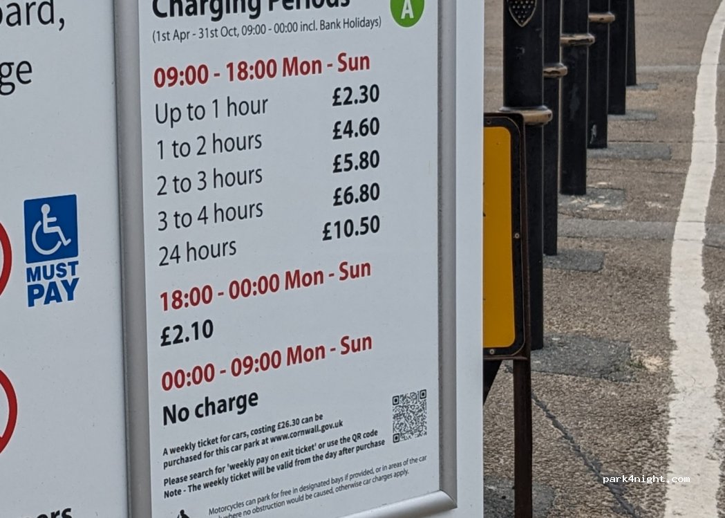 Island car park is right on the beach. There are signs saying it's full seemingly always there, but if you take a look there may be room, especially if you come before 9am. Motor homes and campers aren't allowed over night. 10 minutes walk to the main town front and walks across the coast lead off the car park.