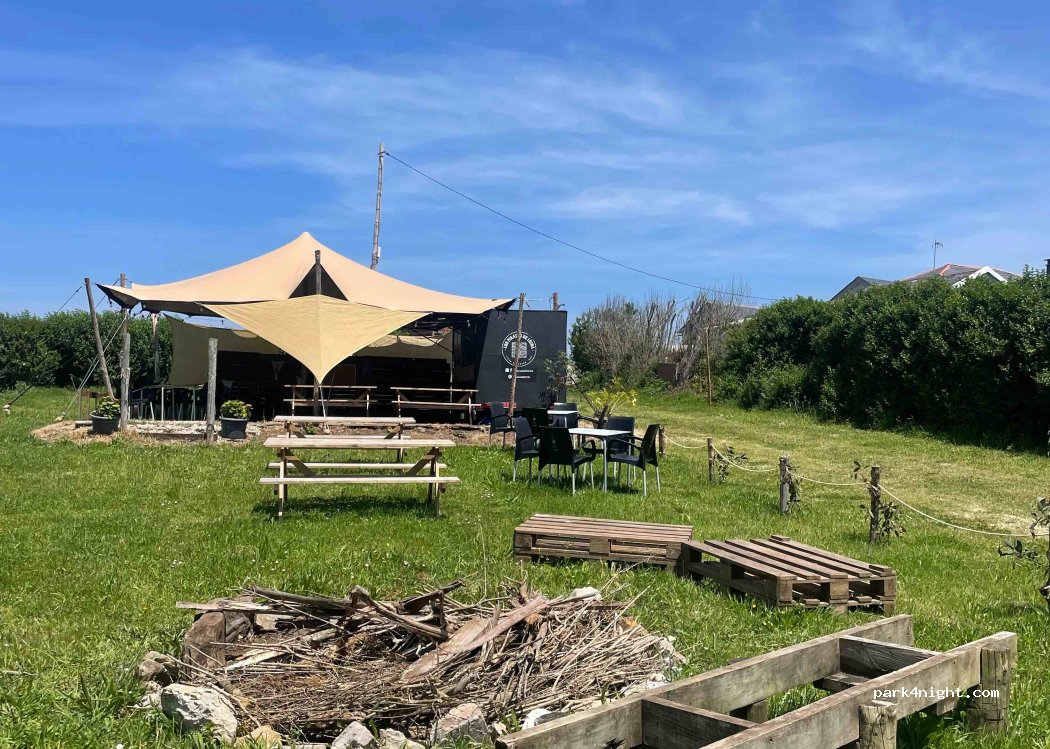 Schicke bar mit Lagerfeuer Platz. Kaltes Bier und Strandnähe. Hier kann man kostenfrei stehen direkt an der wenig befahrenen Straße.