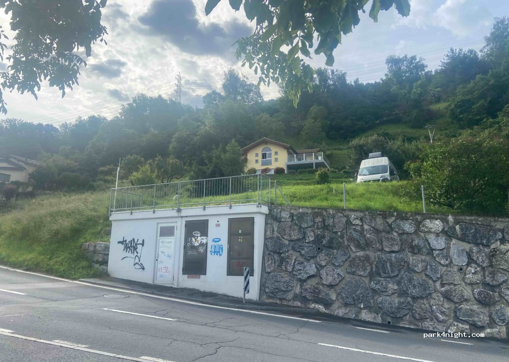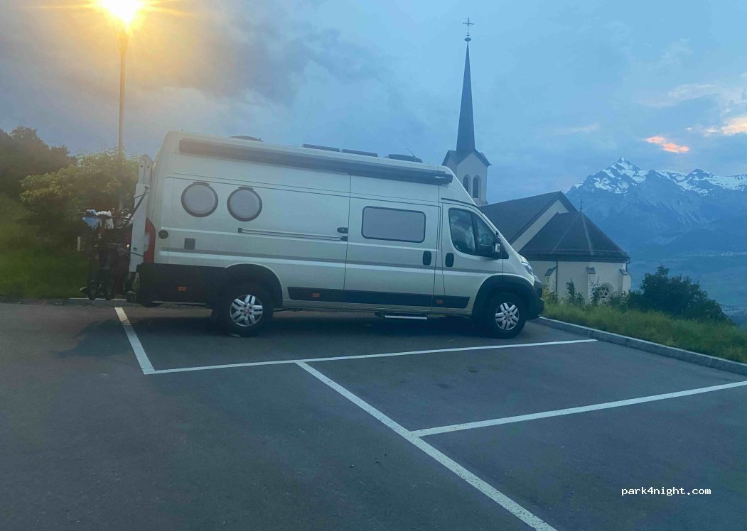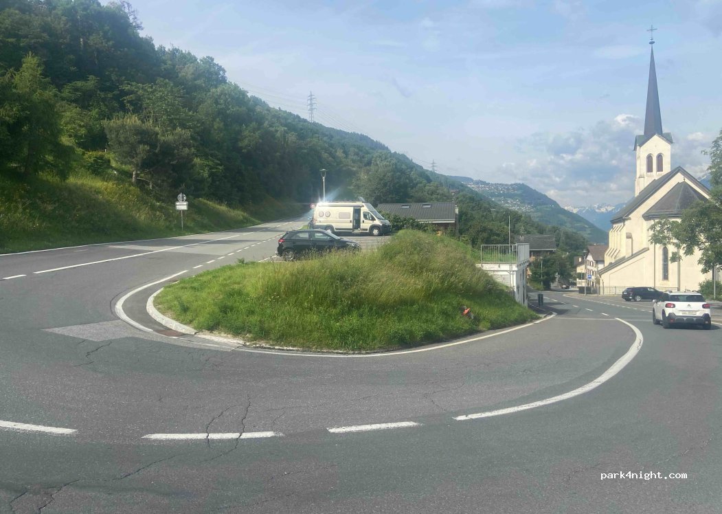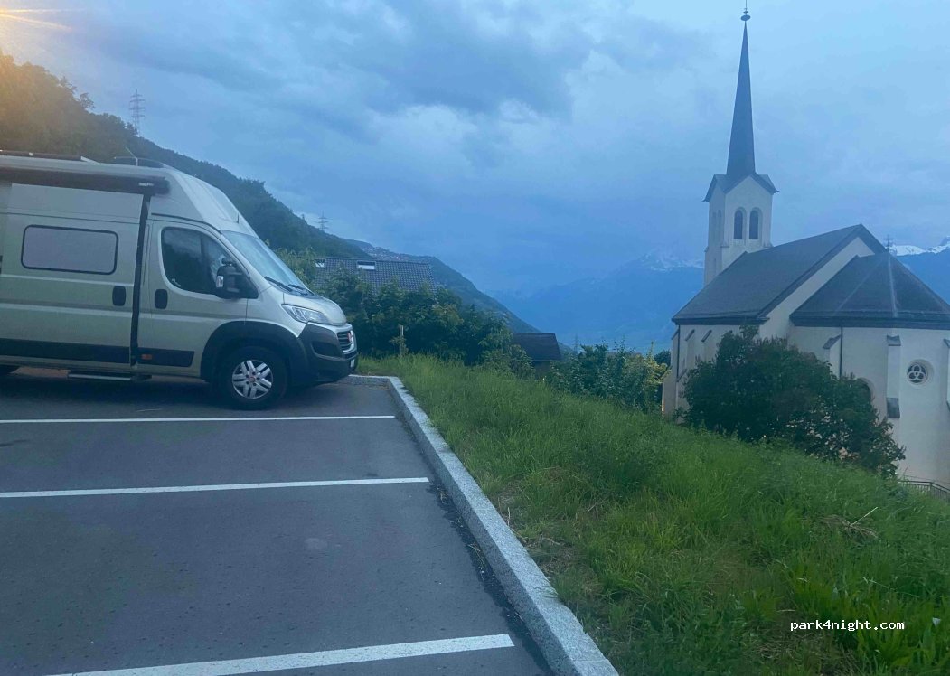 Öffentliche Parkplätze oberhalb der Kirchenparkplätze. Ein Platz ist für längere Fahrzeuge <7Meter ausgewiesen. Längs wie quer schräg. Dank eines Steines und der vollen Ausnutzung der Luftfederung gerade gestanden. Unmittelbar an der Verbindungsstrasse an einer Haarnadelkurve. Daher Motorengeräusche beim Beschleunigen.