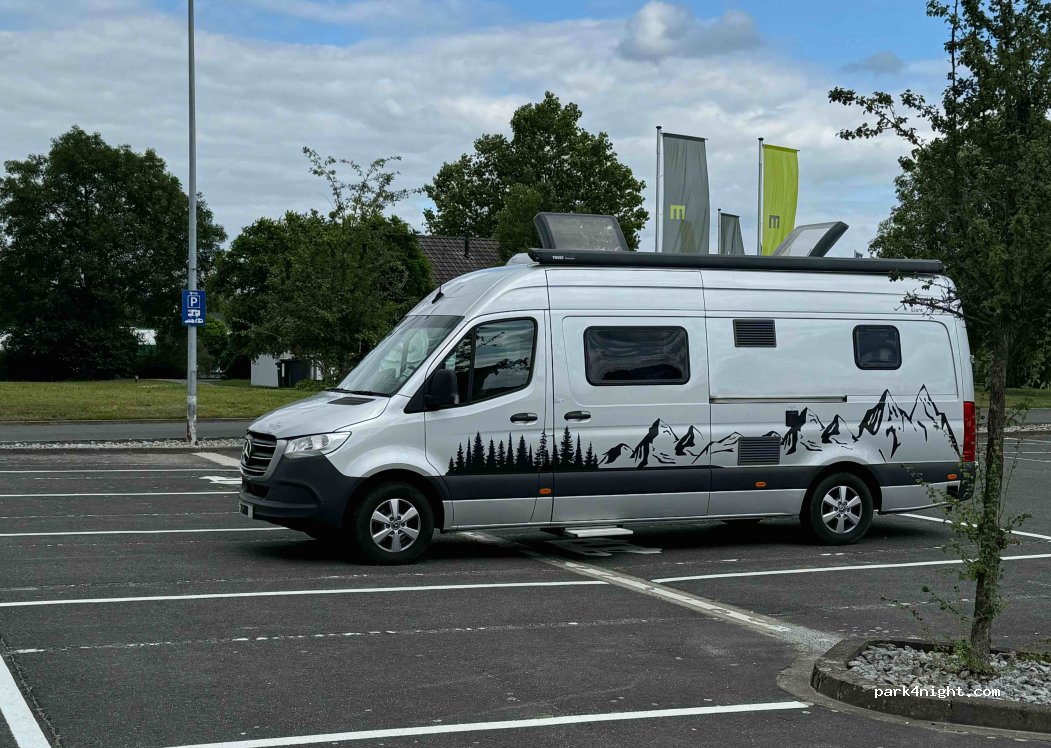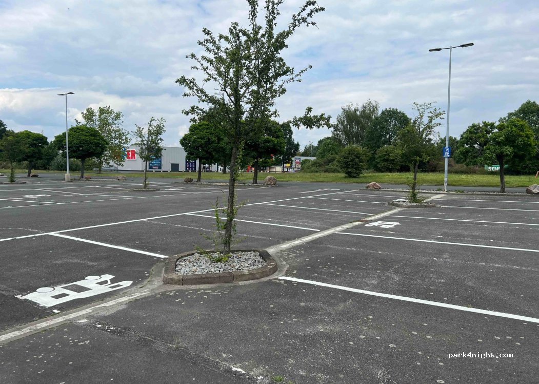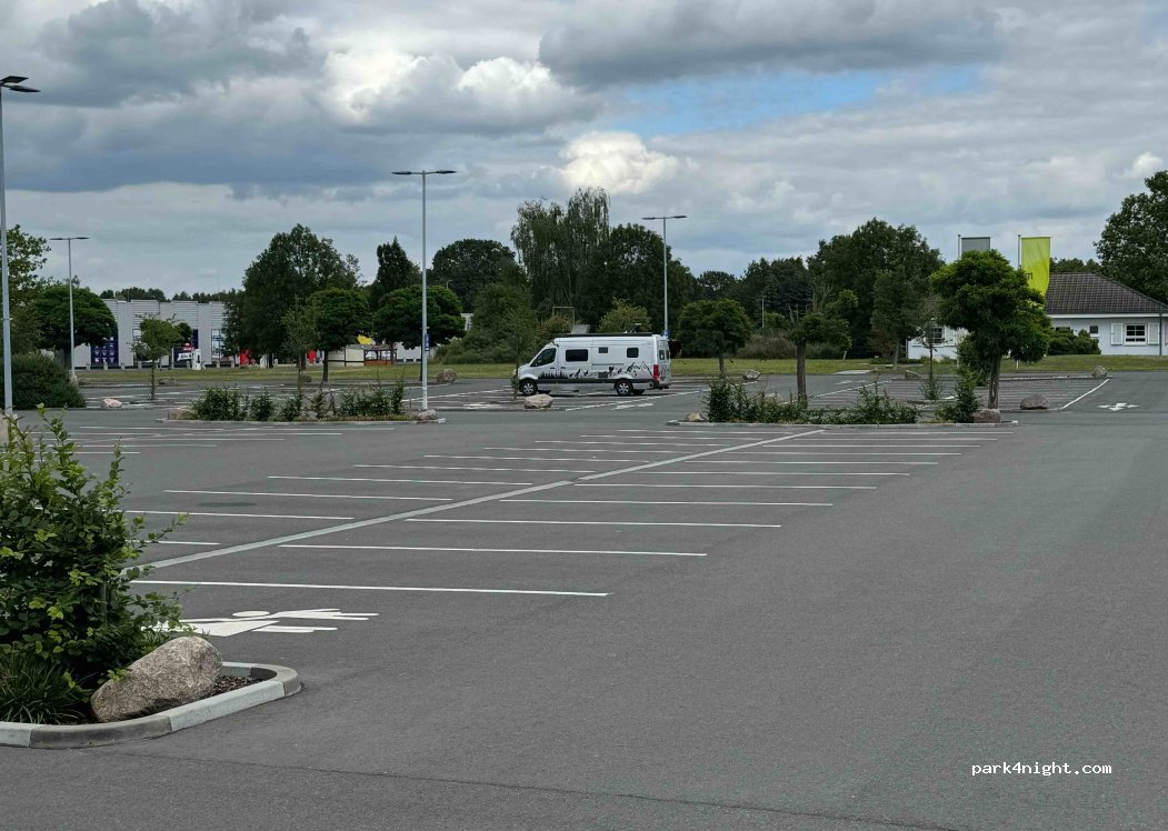 Large parking area with designated motorhome parking for up to maybe 10 to 12 vans but loads of more parking available. There is a supermarket motorbike accessory and DIY store on site. We had a very quiet night as we were the only ones there.