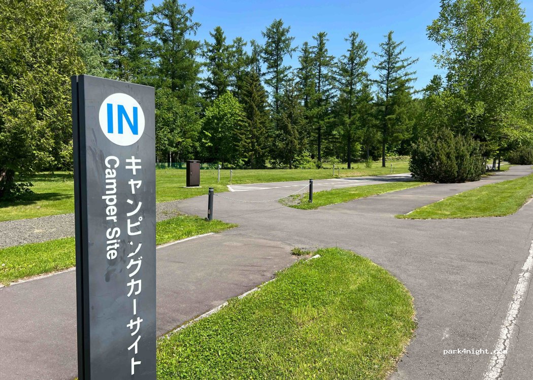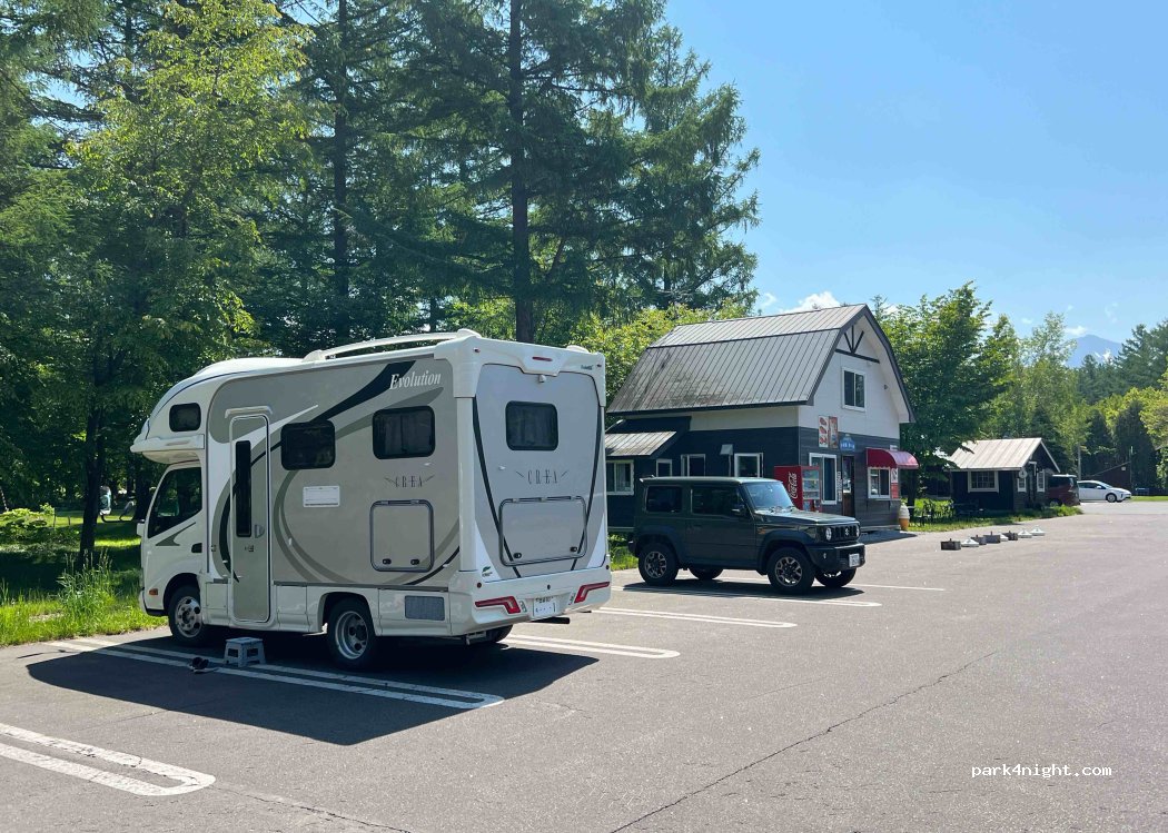 Shirogane Parking and it is in nature. close to the route but calm. there is drinkable water behind the outside toilets in the parking 24h. The toilets were A bit dirty. The showers, washing machine and dryer are in a separate building across the parking and only work from 9-16h30. The electricity spot assignment work only from 9-18h. The food carts and restaurants 9- 17h.