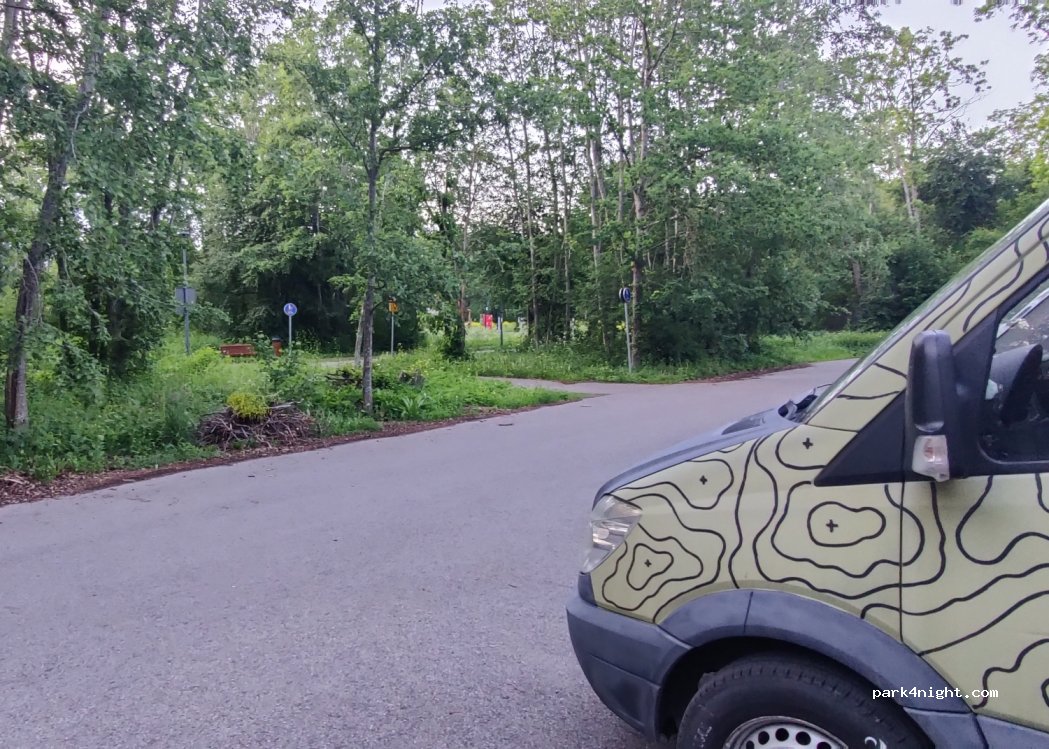 Ruhiger Parkplatz an der Straße, gegenüber ein Park, daneben Wohngebiet. Beleuchtet, Bushaltestelle direkt am Platz. Dixi-Toilette mit Handwaschmöglichkeit – nicht bio, aber okay. Ab 7 Uhr morgens etwas Betrieb wegen Glascontainern und Mülltonnen. Für eine Nacht in der Stadt trotzdem angenehm ruhig.