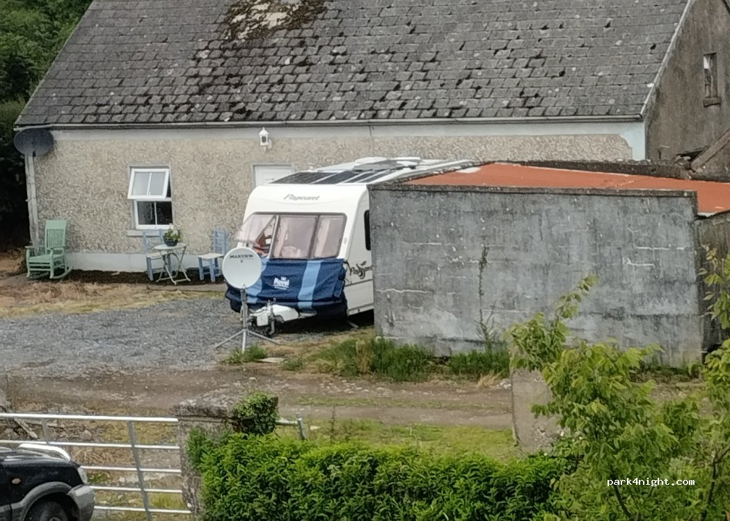 Escale à faire au coeur de l'Irlande. Nuit très au calme, petit chalet à disposition avec poêle, bois, cuisine, salle de bain.... Contacte Facebook, disponible, accueillant, à l'écoute ! Je recommande vivement !! Camping car 3x7m ok!