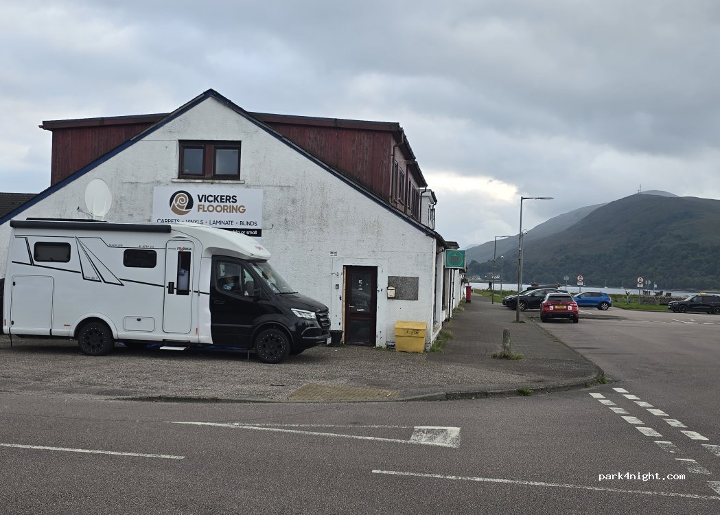 Non loin de la mer. Des toilettes sont ouvertes de 8h à 21h. Il y a également une laverie ouverte de 9h à 17h du lundi au samedi ainsi qu'une supérette et une pharmacie. À 5 minutes du parking des randonnée du Ben Nevis. Moins de midges qu'en forêt car il y a toujours un peu de vent. Interdit de rester la nuit