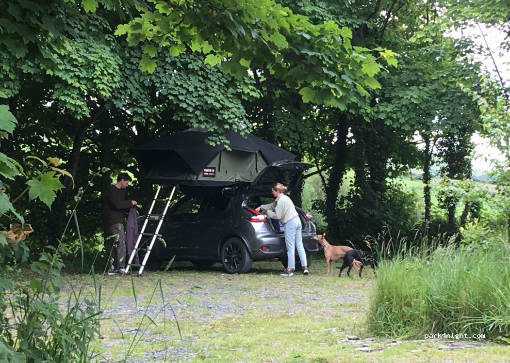 Perfect spot. Gravelled flat area for about 3 campers nestled in the trees - lovely and sheltered. Separate area for tents. Lovely warm showers and washing up/chill/yoga spot in the middle of the field. Very little phone signal. Dog friendly. Lovely friendly owner