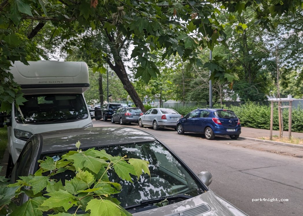 Viale alberato nei pressi dell’Arco di trionfo. Numerosi parcheggi gratuiti a bordo strada, nei pressi di un centro sportivo. Silenzioso ma pieno di zanzare,