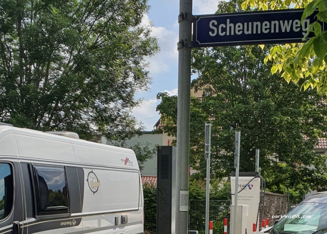 Öffentlicher Parkplatz für 1 Wohnmobil vor den Autoladestationen.