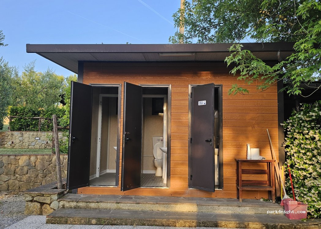 Toskana pur. Wunderschön gelegen. Allerdings sind Keile notwendig. Ver- und Entsorgung prima. Duschen und WC besser im eigenen Mobil. Jeweils ein WC und eine Dusche. Bei großer Hitze wie bei uns im Container 50 Grad unerträglich. Fabrizzio der Chef ist super nett trotz Gesellschaften im Restaurant erhalten wir ein Essen! Super! Eines nur beachten: wie in der gesamten Toskana auch hier Tigermücken