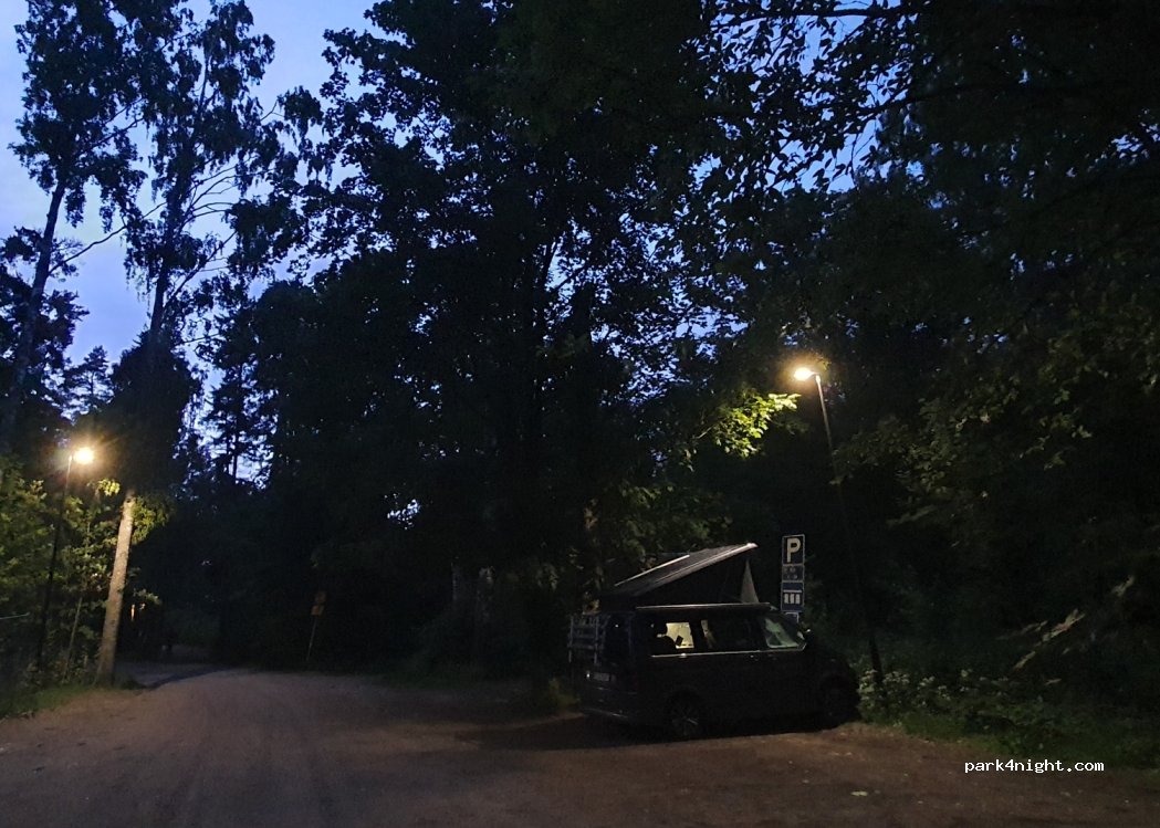Small parking lot on the edge of a park. With a parking meter, you can park freely for 10 hours. Perfect for exploring Seurasaari on foot and there's a dog park 5min walk away.