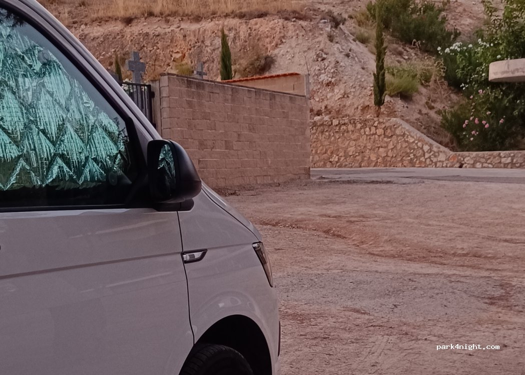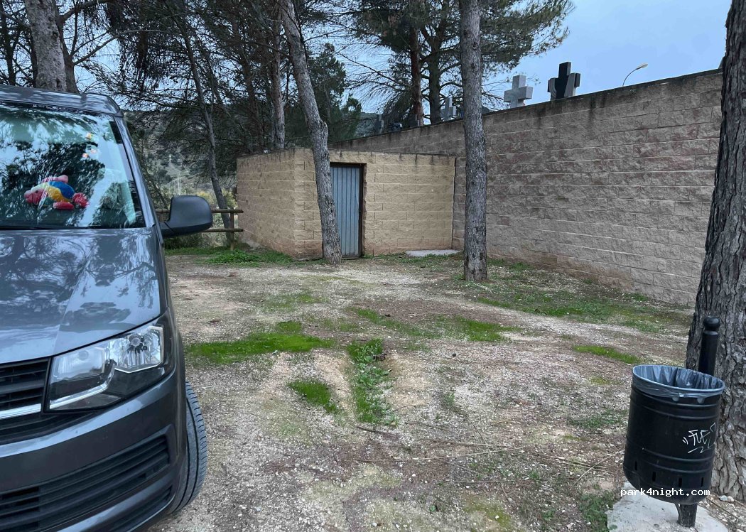 Just al costat del cementeri, que fins i tot es veuen les làpides i les creu. Ens hem quedat un poc abans, en el carrer entre la Repsol i este lloc.