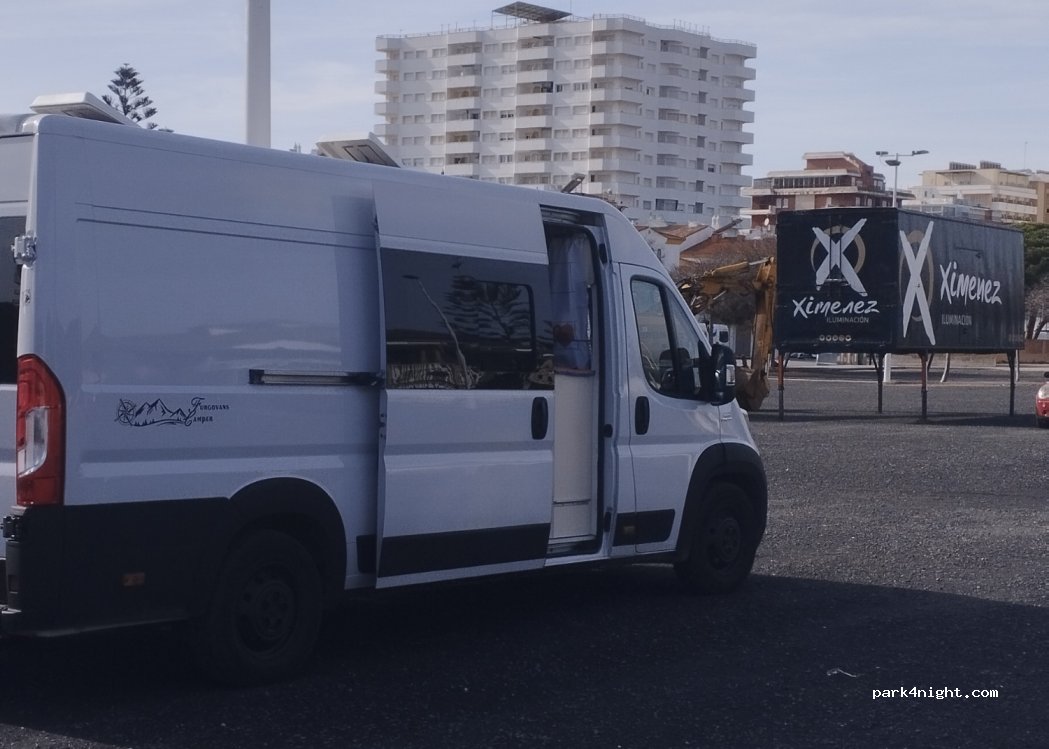 Parking sin servicios ni sombra.Cerca de la playa y de la zona de bares del centro.El fin de semana se pone a tope y no se mueve casi ningún vehículo.Nosotros llegamos el viernes por la mañana y pasamos dos noches sin ningún problema. El tiket de estacionamiento es 2€ para 24 horas.