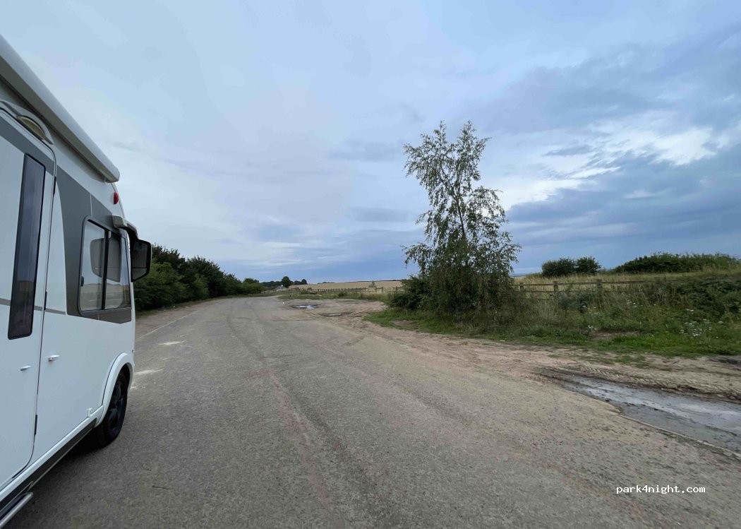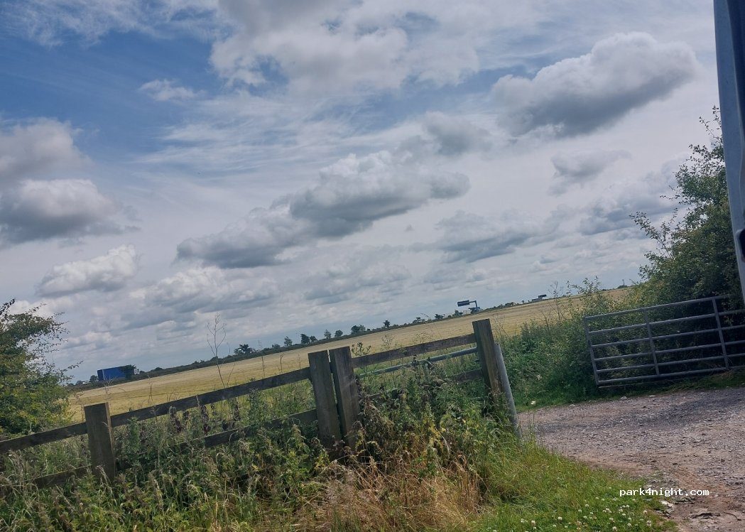 Large layby off the main road. Gate on entrance but I've never seen it closed and doesn't look like it's moved in a long time. Food van parks up here so you may be able to get something to eat. Decent views across farm fields. Close to busy roads so expect traffic noise. Access gates at far end into the farm fields so be careful not block them. Decent place for a quick pit stop or an overnight if you aren't bothered by road noise.
