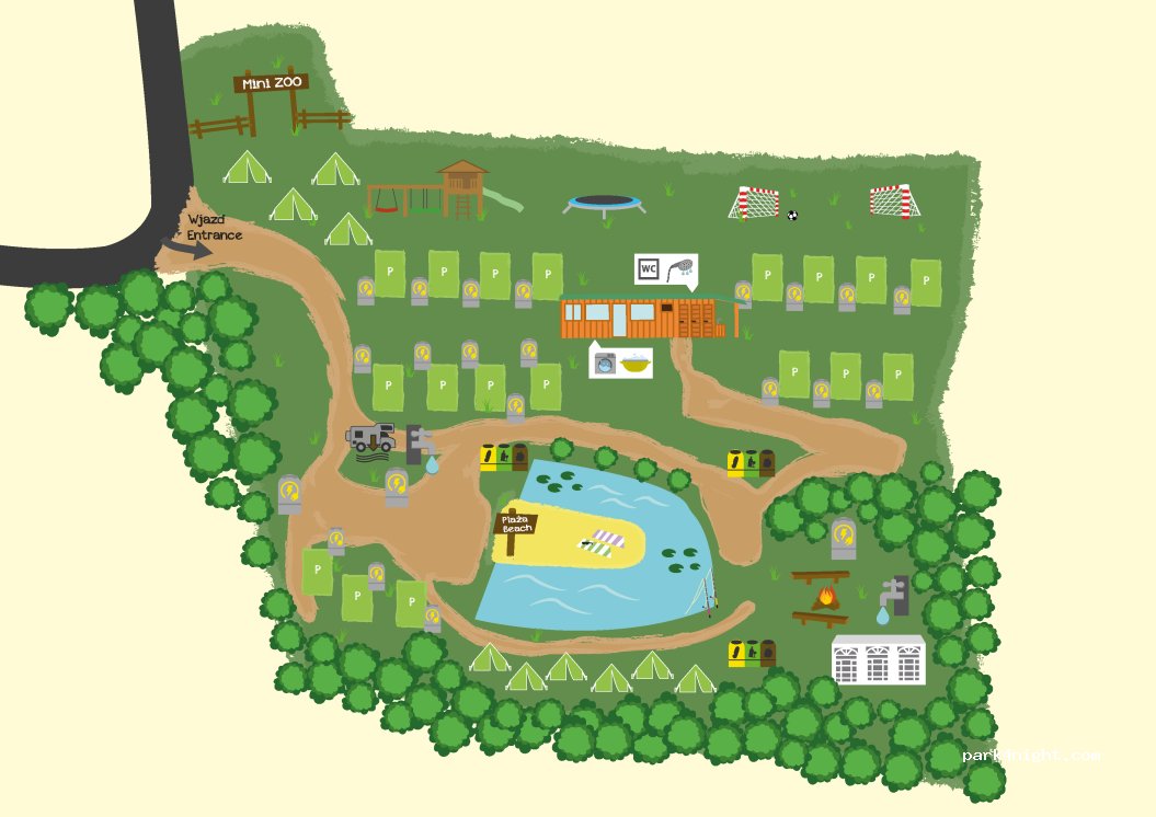 Super endroit ! et avec le sourire Douches et toilettes propres, possibilité de faire une machine de linge pour 8 pln et une super aire de jeux pour les enfants. Top :)
